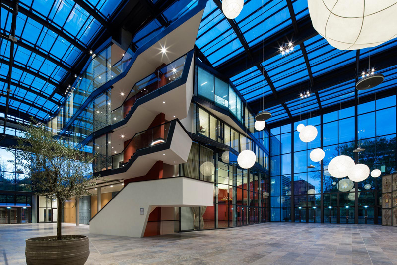 Das Atrium, das als Ball- und Konferenzsaal für 800 Personen genutzt wird, verwandelt sich in eine Mehrzweckhalle für 2.000 Personen, wenn seine Türen geöffnet werden.
